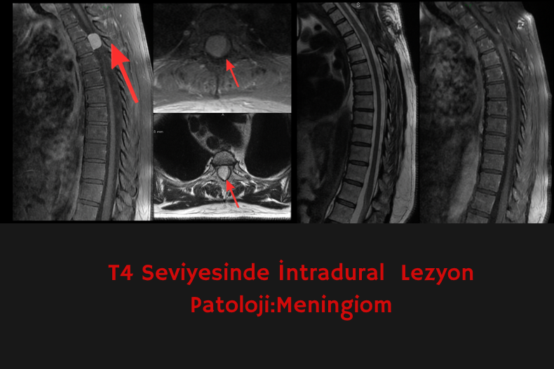 Tedavi: Cerrahi rezeksiyon, spinal menengiomda altın standart tedavidir. Deneyimli ellerde tam rezeksiyon sağlandığında nüks oranı son derece düşüktür. Kalsifiye tümörler veya omurilik damarlarına yapışık lezyonlar teknik açıdan daha zorlu olmakla birlikte, modern mikronöroşirürji teknikleriyle başarılı sonuçlar elde edilmektedir.